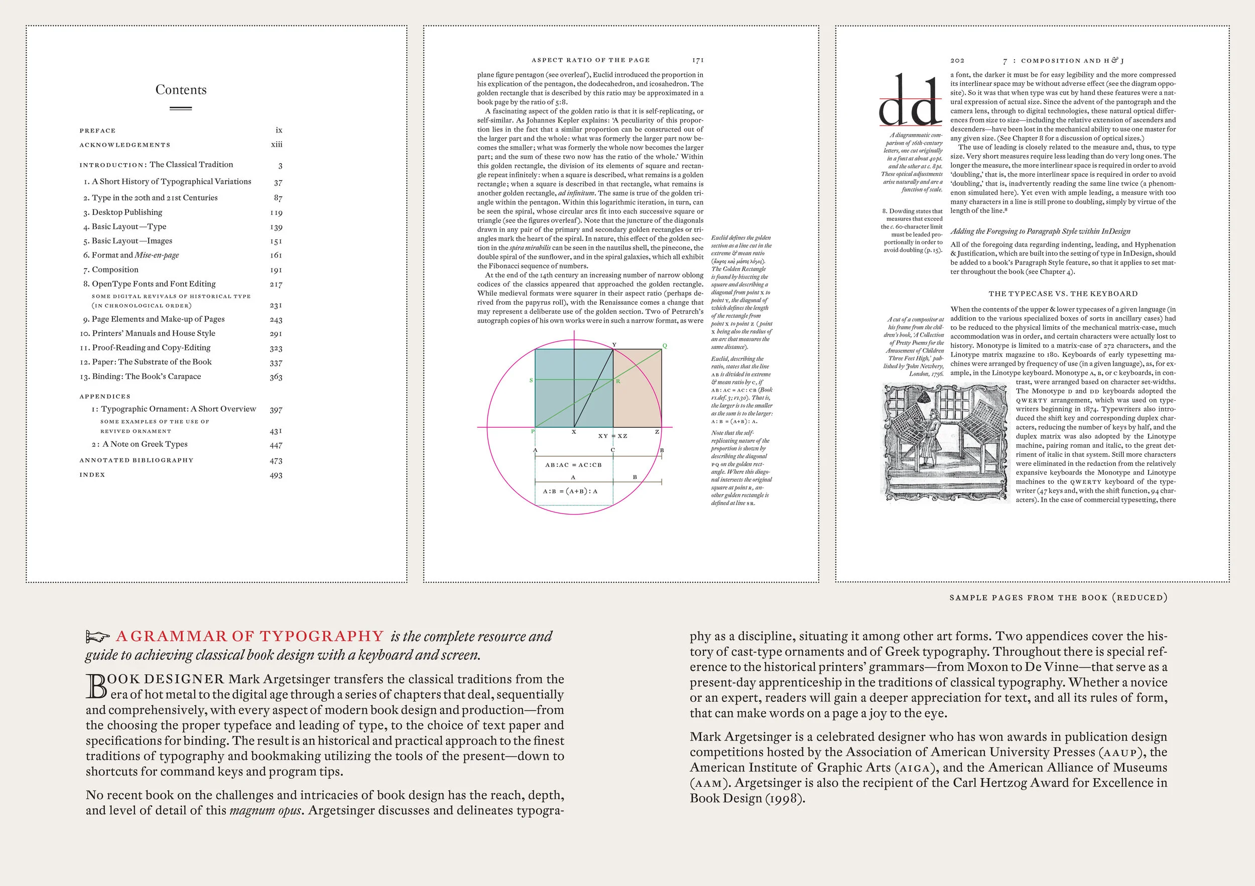A Grammar of Typography is a comprehensive guide to traditional book design that is both practical and historical. Interspersed with discussions of digital typesetting and page layout are broad historical views of the tradition of the book along with specific reference to the printer’s grammar or manual, the industry’s own codification of its usage, from Joseph Moxon in the seventeenth century through Theodore Low De Vinne in the nineteenth.
